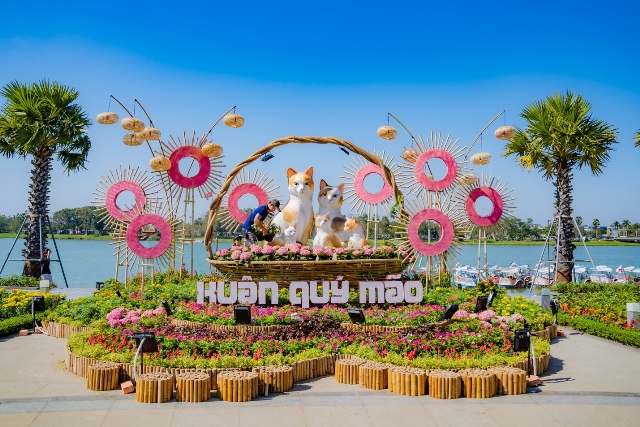 Về linh vật và chất liệu, năm nay, linh vật mèo được lấy cảm hứng từ tranh Tố nữ Bát âm thuộc dòng tranh làng Sình, mô phỏng áo Nhật Bình chơi các loại nhạc cụ cổ truyền. Ở khu vực đài phun nước, đại cảnh gia đình mèo quây quần thể hiện sự mong cầu cho một năm mới an khang, sung túc, khỏe mạnh và may mắn bên gia đình, người thân. Hình ảnh gia đình mèo được thiết kế kết hợp với những giá hoa mặt trời, sử dụng chất liệu mây tre tự nhiên kết hợp với giật cấp, đại cảnh có bố cục nhìn từ trên xuống giống như một bông hoa đang nở rộ, tạo ra tổng thể hài hòa, bắt mắt và không khí xuân rộn ràng.