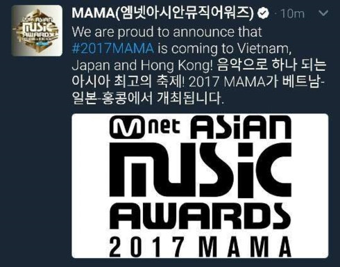 Theo thông báo từ công ty truyền thông và giải trí CJ E&M, lễ trao giải âm nhạc hàng đầu châu Á Mnet Asian Music Awards (MAMA) năm nay sẽ diễn ra tại 3 địa điểm khác nhau là Việt Nam, Nhật Bản và Hồng Kông.
