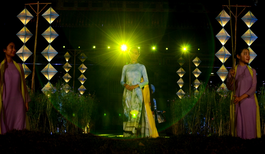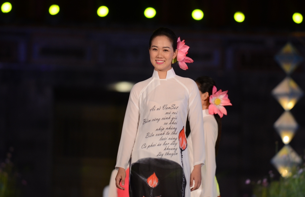 Trên chất liệu lụa truyền thống, “Áo dài trên con đường di sản” giới thiệu các danh lam thắng cảnh nổi tiếng trên con đường di sản miền Trung. Đó là Thành nhà Hồ của Thanh Hóa, dân ca ví dặm của vùng Nghệ - Tĩnh, Phong Nha – Kẻ Bàng của đất Quảng Bình, Quần thể di tích triều Nguyễn của Cố đô Huế và phố cổ Hội An, Thánh địa Mỹ Sơn của xứ Quảng Nam.