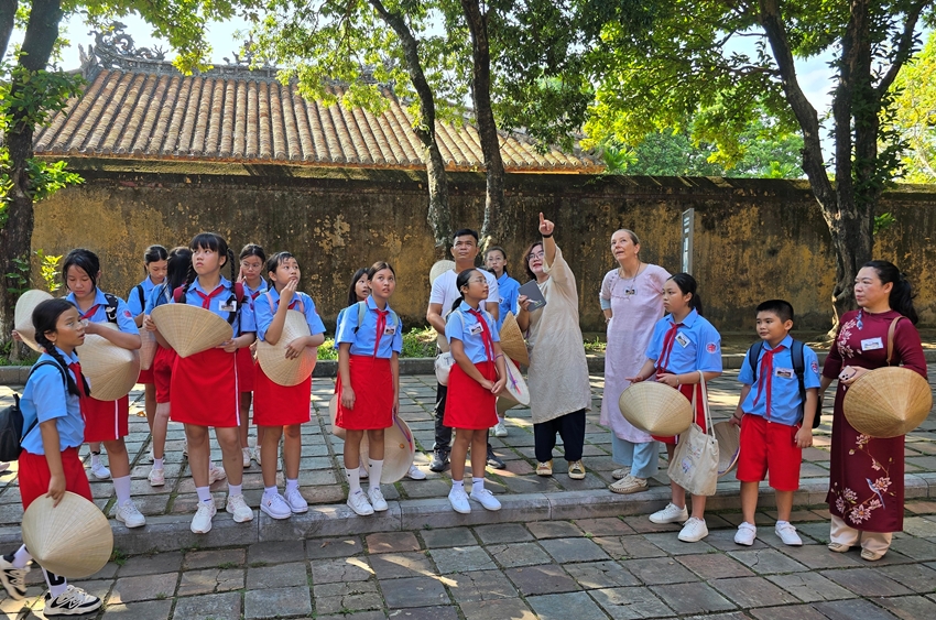 | Học sinh nghe giới thiệu về di tích điện Phụng Tiên - Đại Nội Huế |