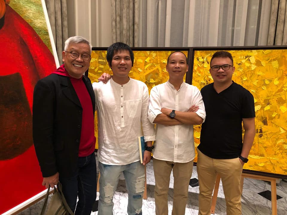 Họa sĩ Lê Minh Phong và Trần Vĩnh Thịnh (thứ 2 và 3 từ trái sang) tại triển lãm. Ảnh: V.T