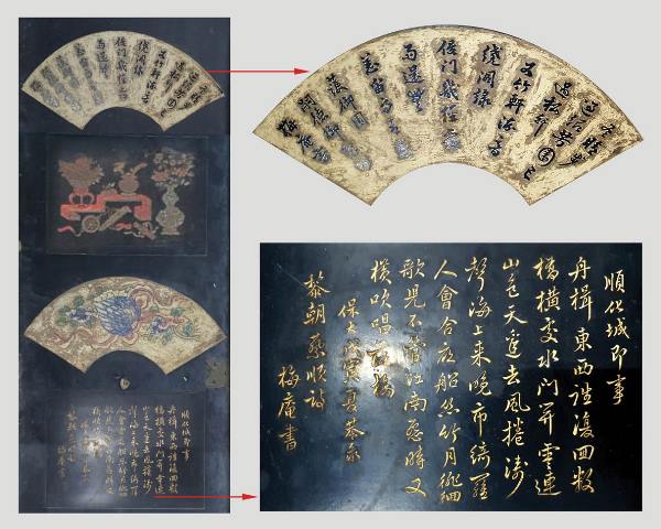 Phần còn lại của tấm trấn phong tại Bảo tàng CVCĐ Huế có 11 ô thơ chữ Hán và 13 ô vẽ bát bửu, cổ đồ dạng tĩnh vật. Xung quanh phần tạo khung và đường diềm khắc chạm hoa sen, hoa lá dây cách điệu. Phần thơ chữ Hán được thể hiện đầy đủ 5 loại thể chữ khải thư, thảo thư, triện thư, lệ thư. Sau khi đối chiếu, có thể khẳng định rằng, thơ khắc trên 4 trấn phong này đều trùng khít nội dung bài và tác giả. Trong đó thơ vua Lê Thánh Tông (được khắc 1 bài); vua Tự Đức (11 bài); Thái Thuận (1 bài); Tùng Thiện Vương (2 bài); Tuy Lý Vương (2 bài); Bùi Văn Dị (3 bài).