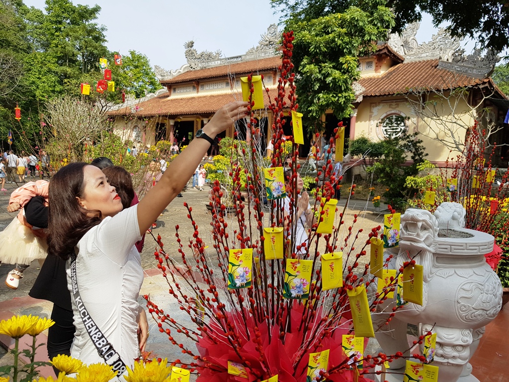Hầu hết chùa nào cũng trang trí các loại cây và treo lên đó những nhánh lộc để mọi người hái