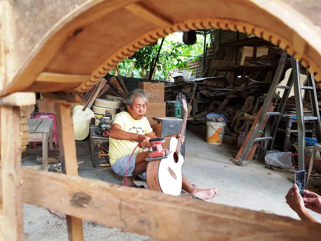Một cụ ông đang mài lại đàn cho bóng mịn. Hầu như các công đoạn cho ra một cây đàn guitar rất vất vả, ở đó không chỉ đòi hỏi tâm sức mà còn bằng cả trái tim của người làm đàn