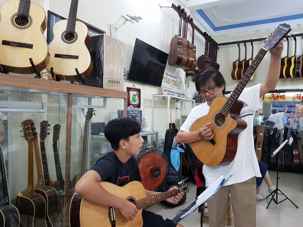 Ngoài thời gian ở xưởng, ông Việt cũng có những phút giây thư giãn khi mở lớp dạy đàn miễn phí ở tư gia