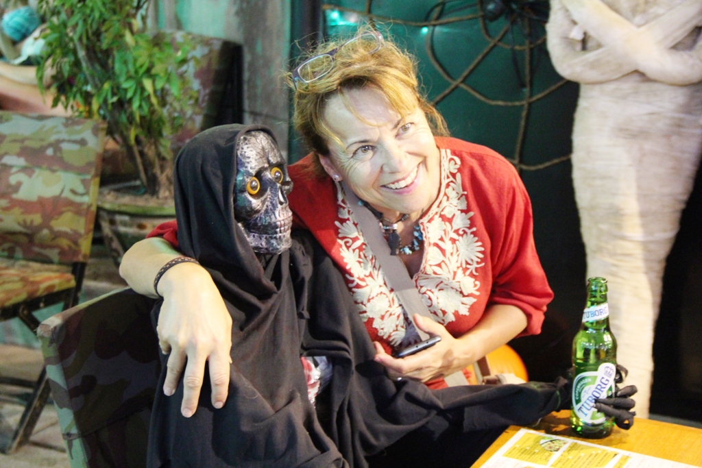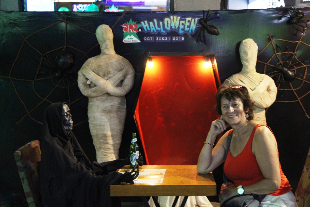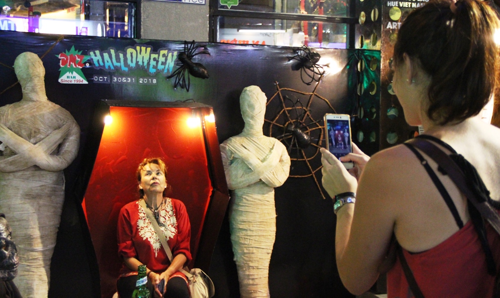 Trong khi đó, một vài cửa hàng, cửa tiệm quanh TP. Huế cũng đã có những màn trang trí “ma quái” để chào đón du khách, người dân đến vui chơi. Cũng như mọi năm, khu trang trí nhộn nhịp nhất vẫn ở tuyến phố Tây Phạm Ngũ Lão – Võ Thị Sáu – Chu Văn An. Những hình nộm được treo lơ lửng, những chiếc bàn có một vị khách ma quái, hay những chiếc đầu lâu rùng rợn, mạng nhện rộng lớn… sẽ khiến nhiều người chưa quen phải giật mình. Ngược lại, một vài người biết đến lễ hội tỏ tự tin tạo dáng chụp hình cũng như chọc ghẹo những hình tượng ma quái ấy.
