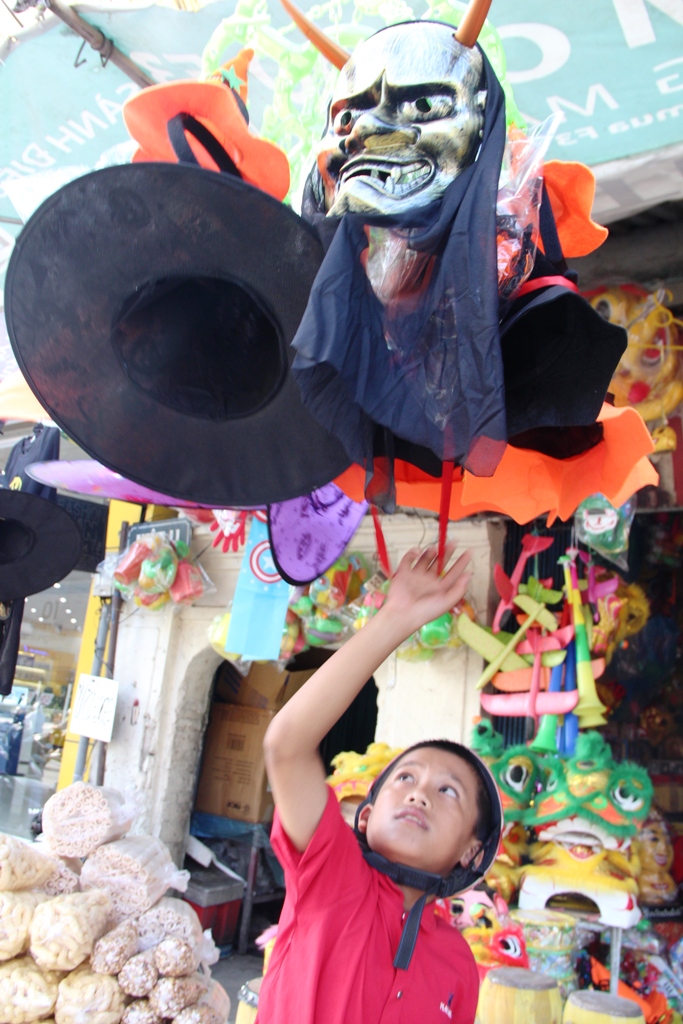 Một em nhỏ chọn mua cho mình một món đồ chuẩn bị cho lễ hội Halloween