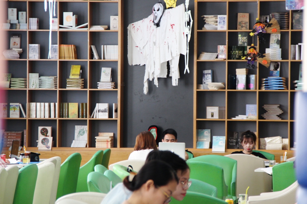 Ngay cả không gian một quán cà phê sách cũng được trang trí khá rùng rợn với bộ trang phục ma quái, tả tơi