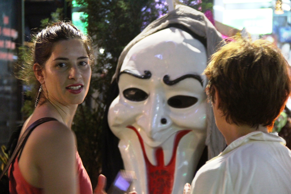 Một chiếc mặt nạ ma quái trên đường phố để du khách, người dân có thể chụp hình