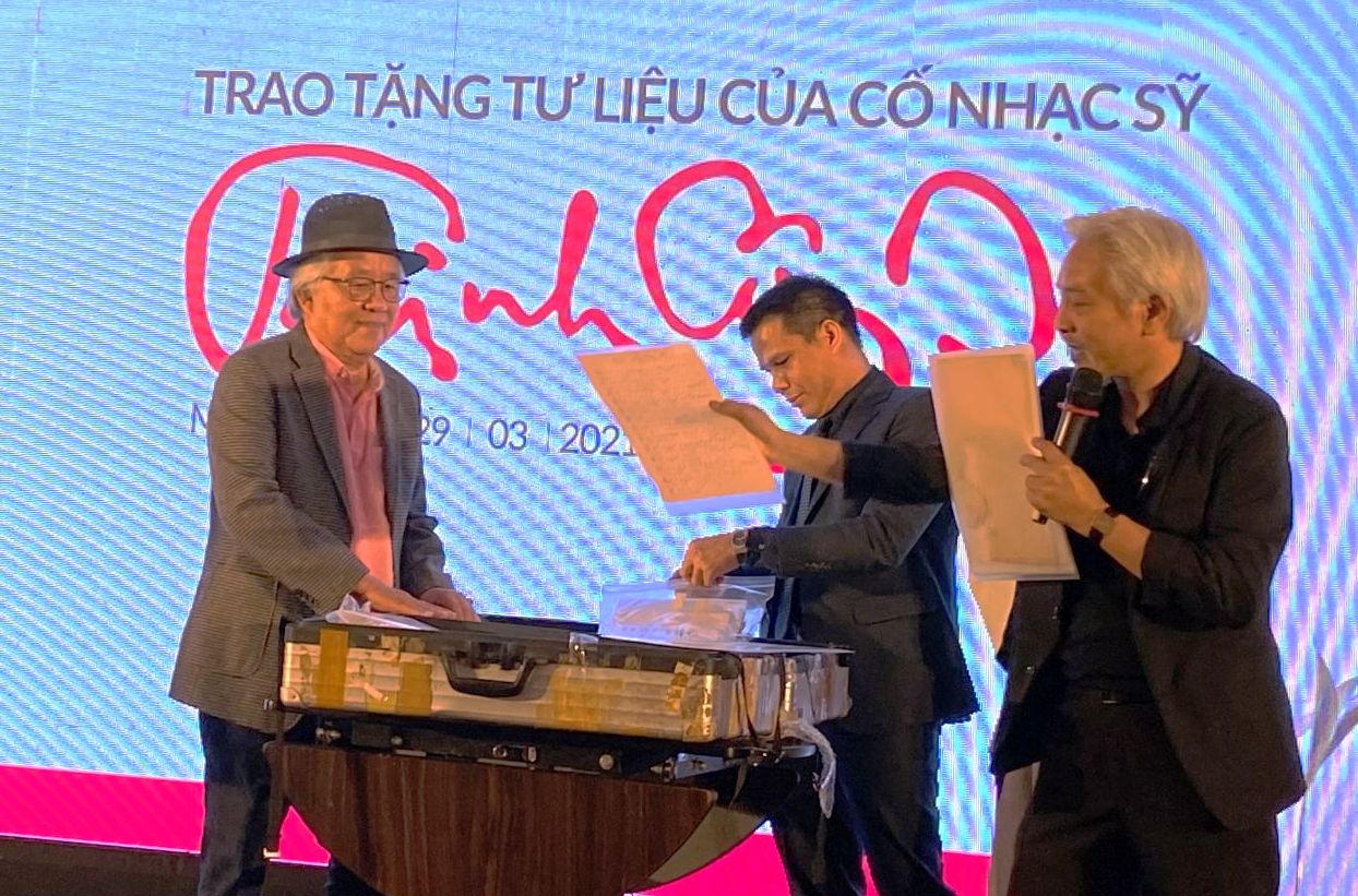 Nghệ sĩ nhiếp ảnh Dương Minh Long trao kỷ vật về nhạc sĩ Trịnh Công Sơn cho bà Trịnh Vĩnh Trinh