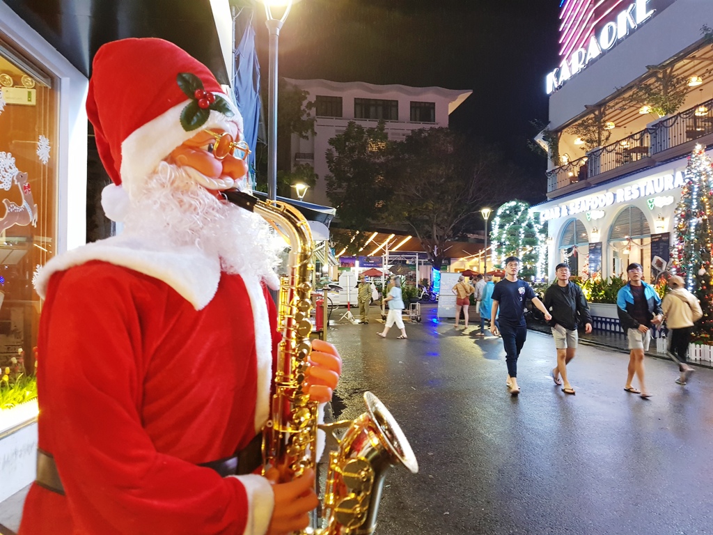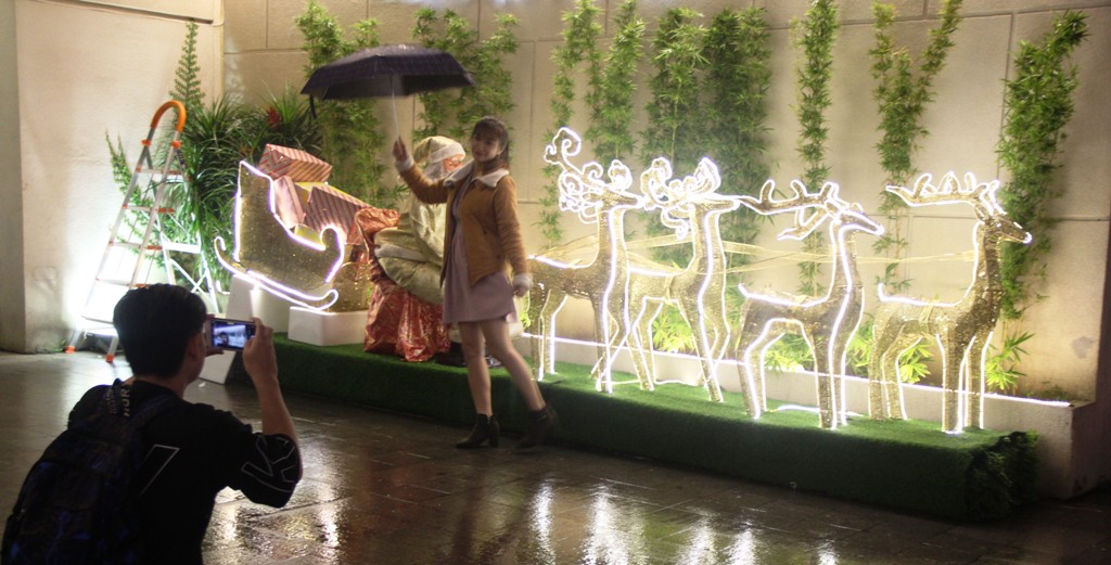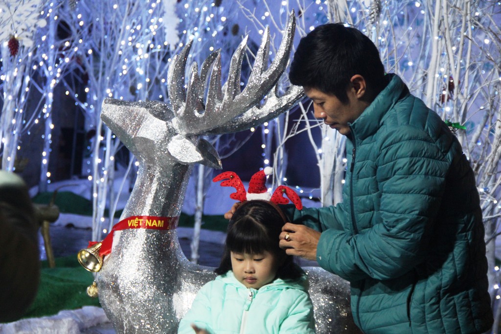 Ghi nhận của Thừa Thiên Huế Online đêm 14/12, những cây thông cỡ lớn, những chú tuần lộc bằng xốp, hay những ông già Noel với bộ trang phục đỏ rực… đã được các nhà hàng, khách sạn, những khu vui chơi công cộng trang trí hoành tráng. Cạnh đó, những gia đình, bạn trẻ quây quần bên nhau vui đùa, tạo dáng chụp hình kỉ niệm.
