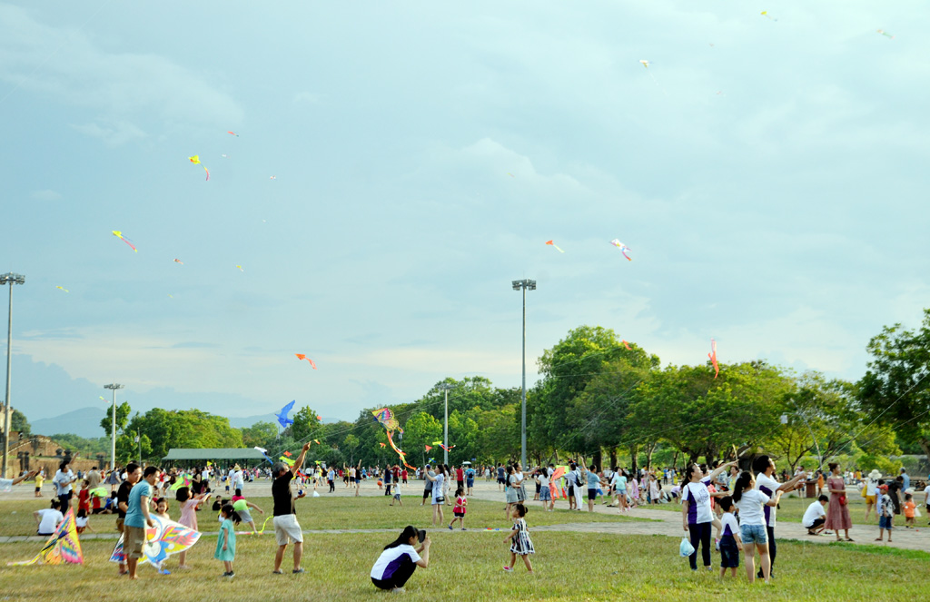Hàng trăm người dân và du khách tham gia hoạt động thả diều càng làm cho không khí thêm sôi động, vui tươi