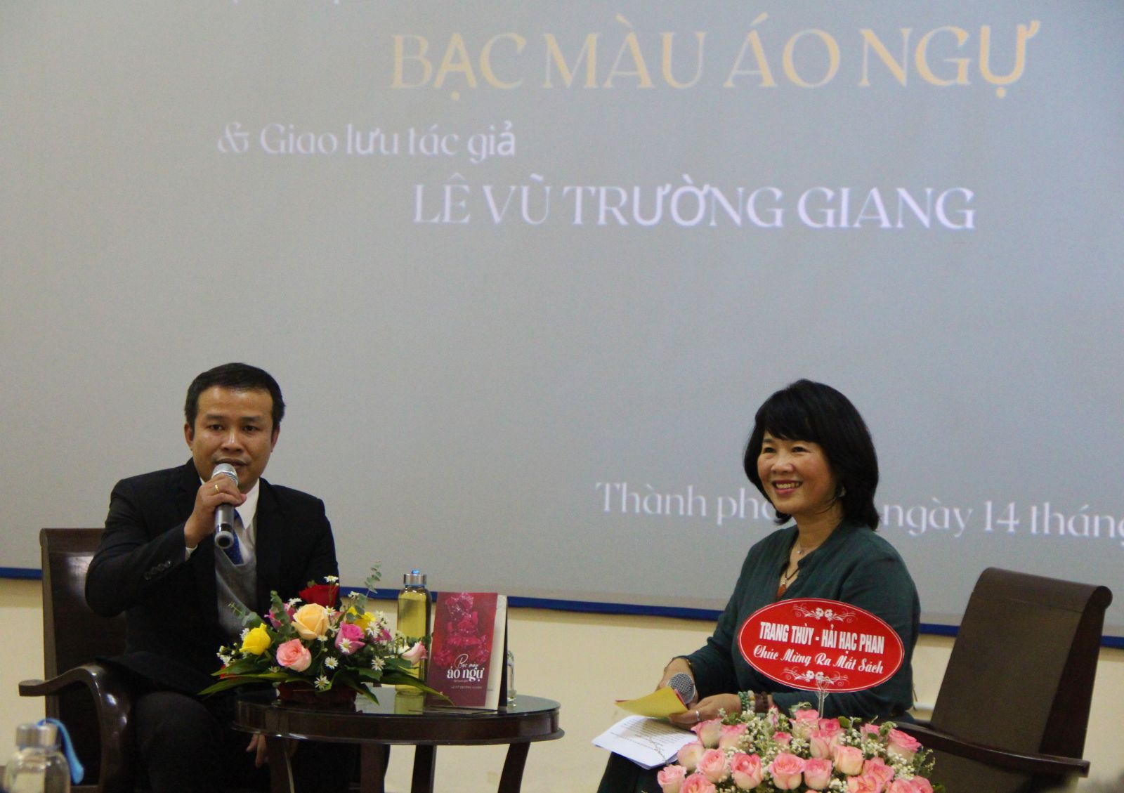 Nhà văn Lê Vũ Trường Giang (trái) trao đổi với độc giả tại buổi ra mắt tập truyện ngắn