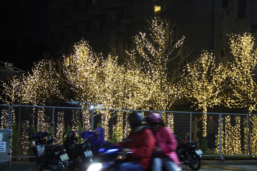 Một không gian cây được trang trí màu vàng trên đường Lê Lợi vô cùng ấn tượng khiến nhiều người qua lại cảm nhận được mùa Giáng sinh và năm mới đến rất gần