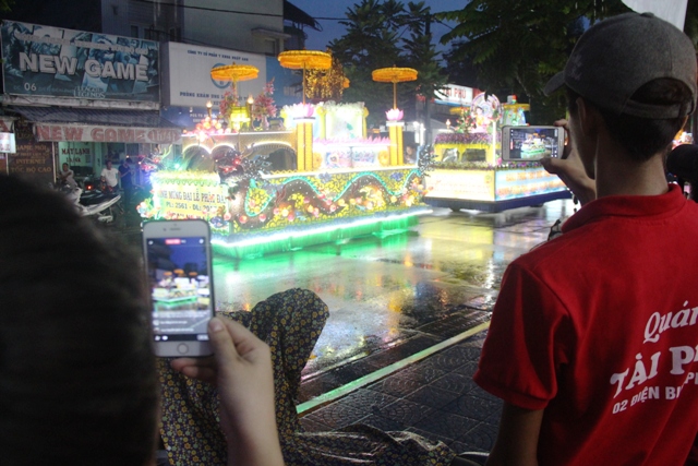 Dưới tiết trời mưa nhẹ, mỗi nơi đoàn đi qua có rất đông người dân Huế và du khách đứng chờ cùng dòng người nguyện cầu quốc thái dân an, hòa bình thế giới.