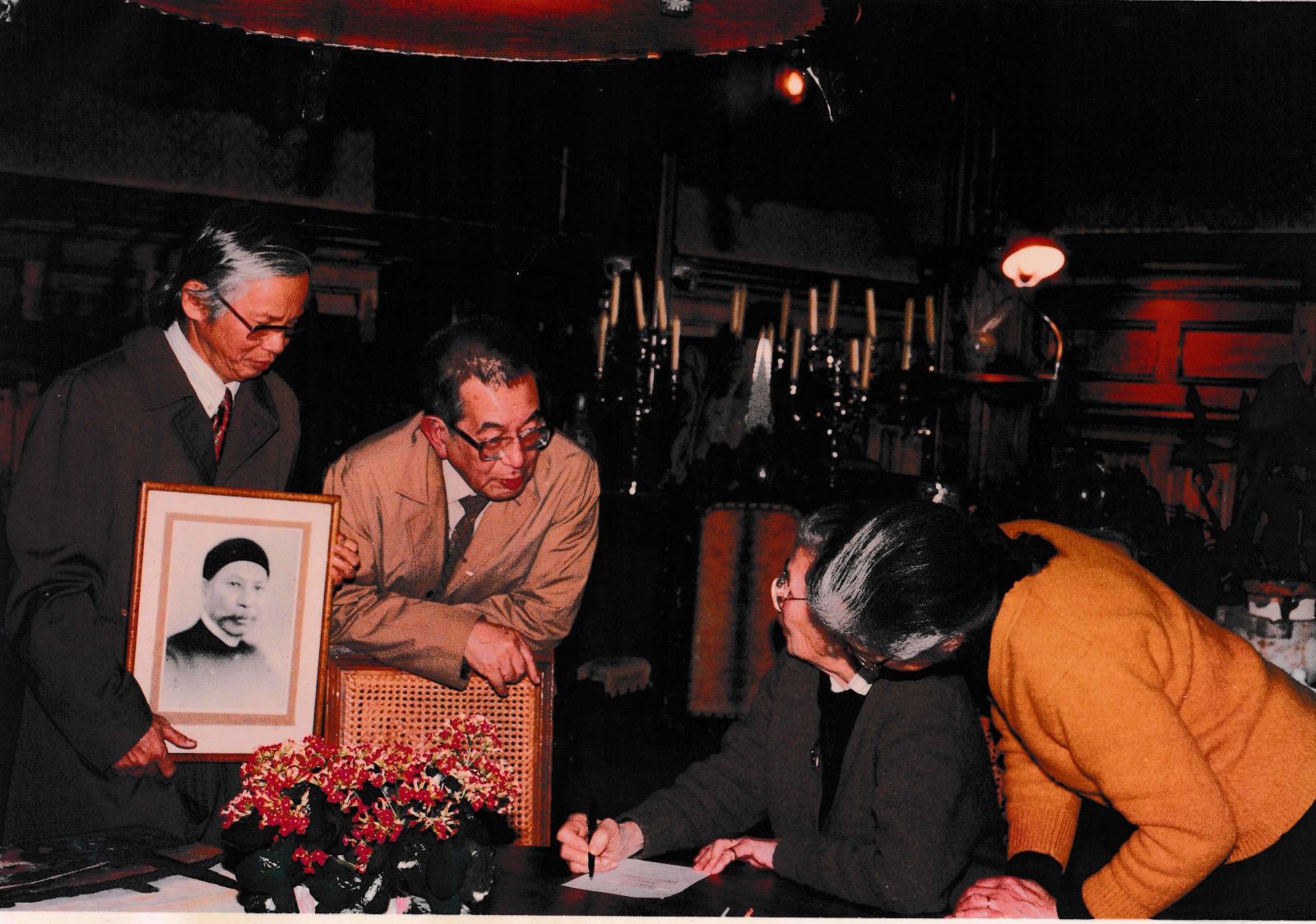 Tác giả giữ tấm ảnh chân dung vua Hàm Nghi, dược sĩ Nguyễn Duy Thản, Công chúa Như Lý, bà Anne Dabat. (Từ trái sang). Ảnh Nhân vật cung cấp