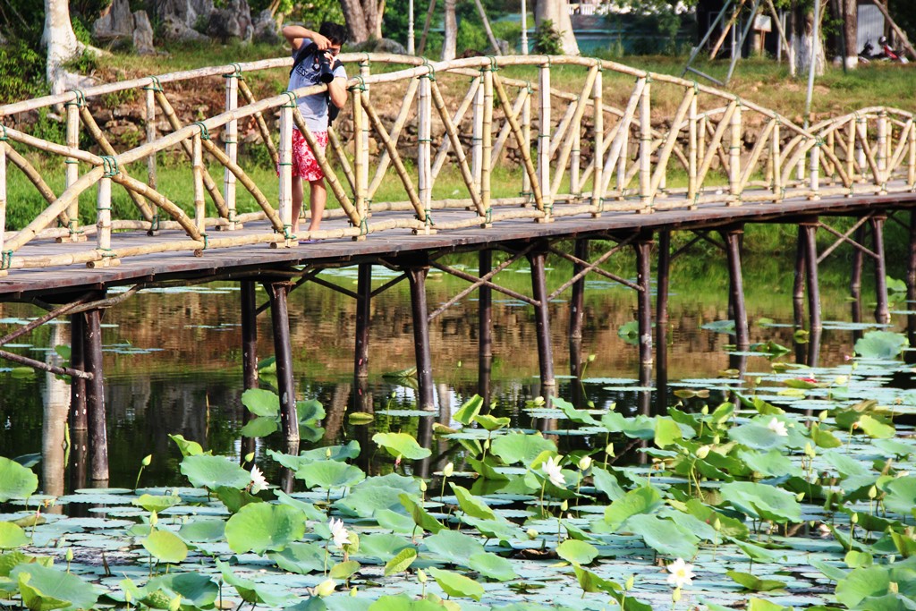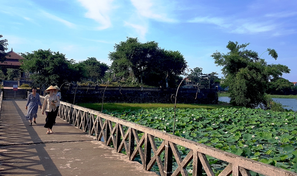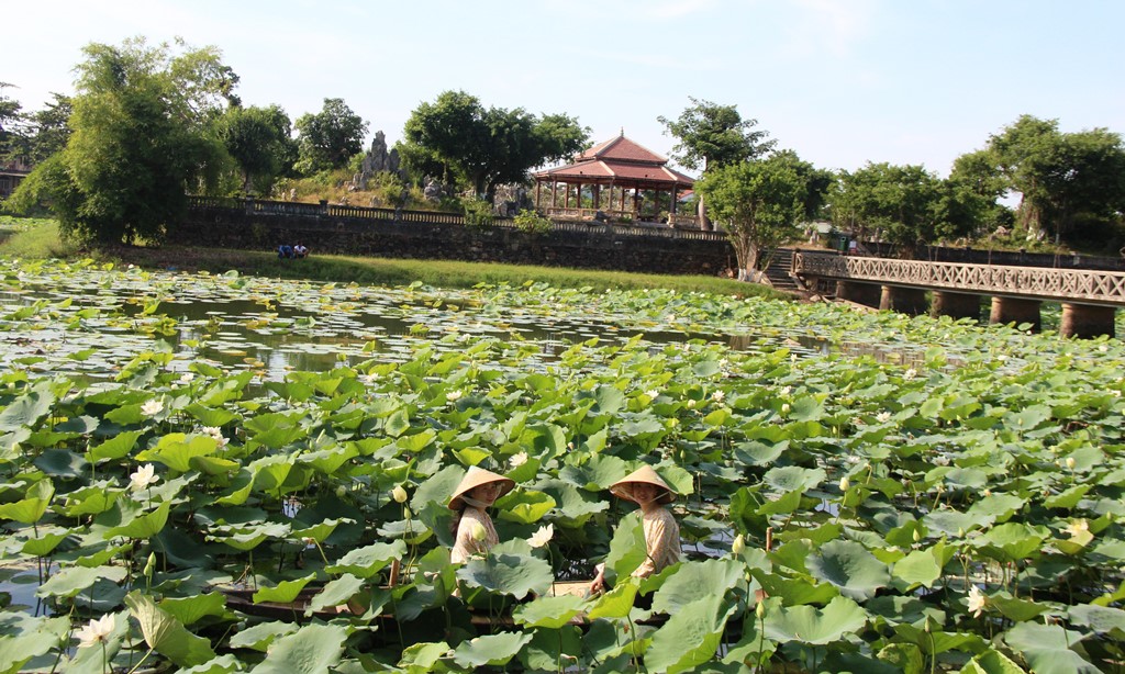 Du khách dạo ngang hồ Tịnh Tâm chụp hình loài danh hoa xứ Huế