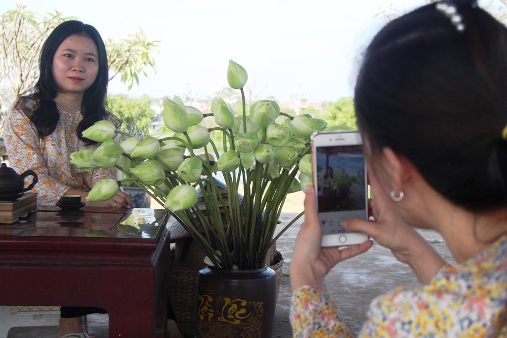 Bạn trẻ tạo dáng chụp hình bên bình hoa sen trắng trồng ở hồ Tịnh Tâm