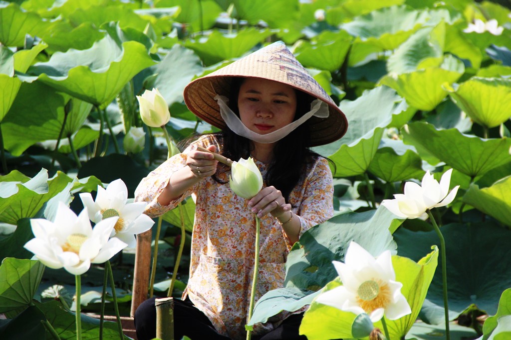 Việc trồng sen trắng được Công ty TNHH MTV Hữu cơ Huế Việt liên kết với người dân sống quanh hồ Tịnh Tâm
