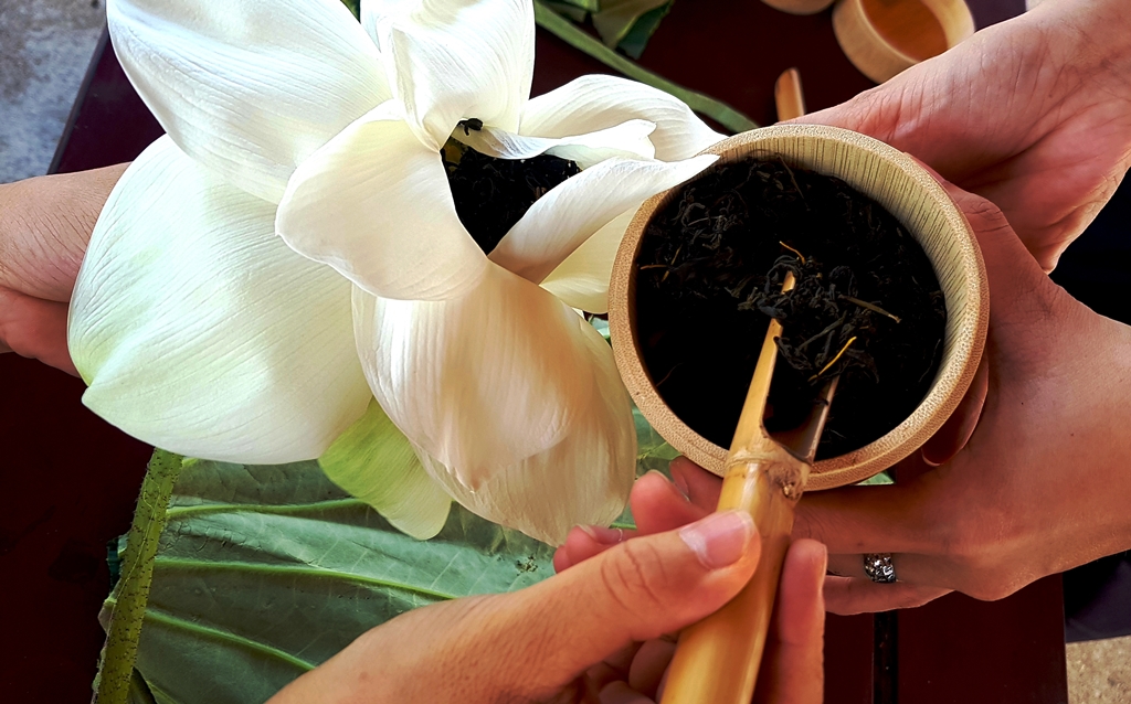 Một công đoạn ướp trà vào hoa sen