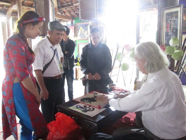 Không chỉ trưng bày triển lãm, tại Không gian Thư pháp, du khách được các nhà thư pháp “cho chữ”. Những nét bút “phượng múa, rồng bay” làm nao lòng du khách. Ông Nguyễn Văn Minh, du khách đến từ Lào Cai chia sẻ: “Tôi là một người mê thư pháp nên bị cuốn hút lúc nào không hay. Ở đây có nhiều tác phẩm giữ được cốt cách của thư pháp cổ, lại pha trộn dáng dấp của hội họa, đẹp nghệ thuật và tao nhã. Tôi được một nhà thư Pháp tặng chữ Huế, lại vẽ nên gương mặt chữ điền e ấp của cô gái Huế bằng chính các nét chữ, rất độc đáo”.