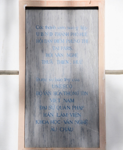 Tấm bia phía trước tường nhà trưng bày ghi rõ các thành viên sáng lập nhà trưng bày tác phẩm Điềm Phùng Thị gồm UBND TP. Huế, Hội bạn Điềm Phùng Thị tại Paris, Hội Văn nghệ Thừa Thiên Huế. Cùng với đó là sự bảo trợ của UNESCO, Bộ Văn hóa - Thông tin, Đại Sứ quán Pháp, Hàn lâm viện Khoa học - Văn nghệ châu Âu