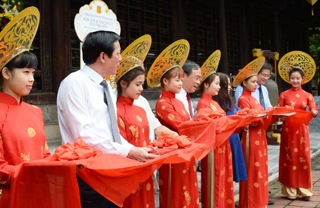 | Chủ tịch UBND tỉnh Nguyễn Văn Cao (thứ 6 bên phải) dự và cắt băng khai mạc triển lãm |