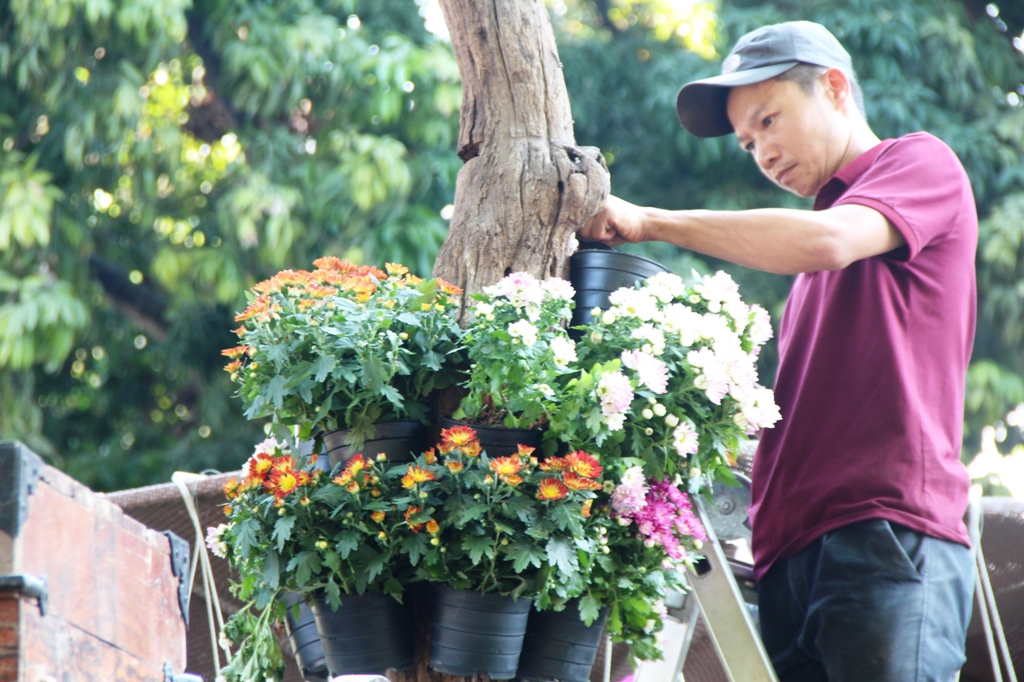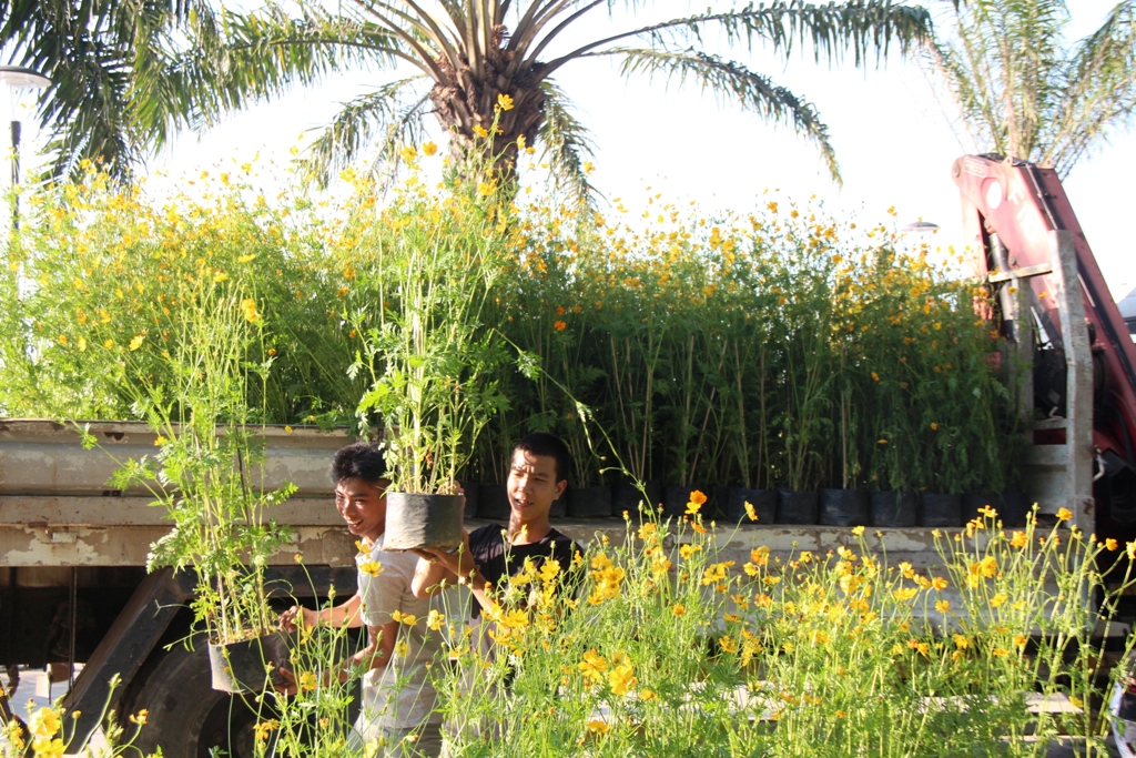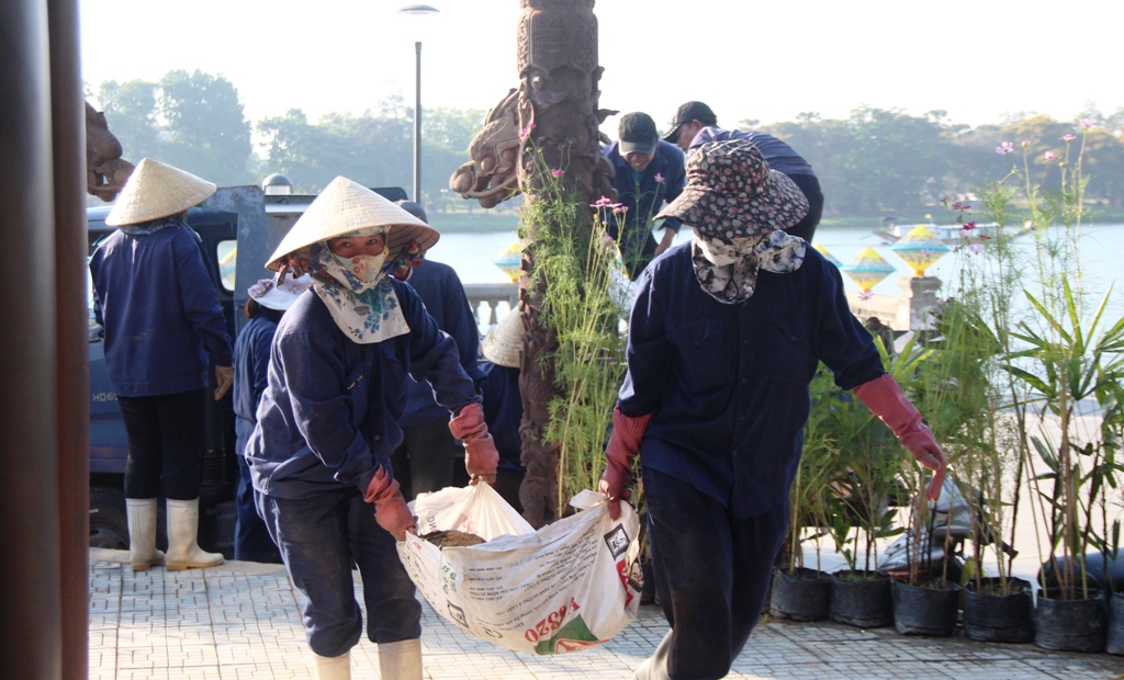Những công đoạn cuối cùng đang được nhân viên Trung tâm Công viên cây xanh Huế thực hiện, làm đẹp cho không gian lễ hội