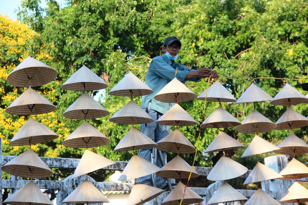 Có rất nhiều nón lá được trang trí, cùng với hệ thống đèn chiếu sáng ở không gian lễ hội