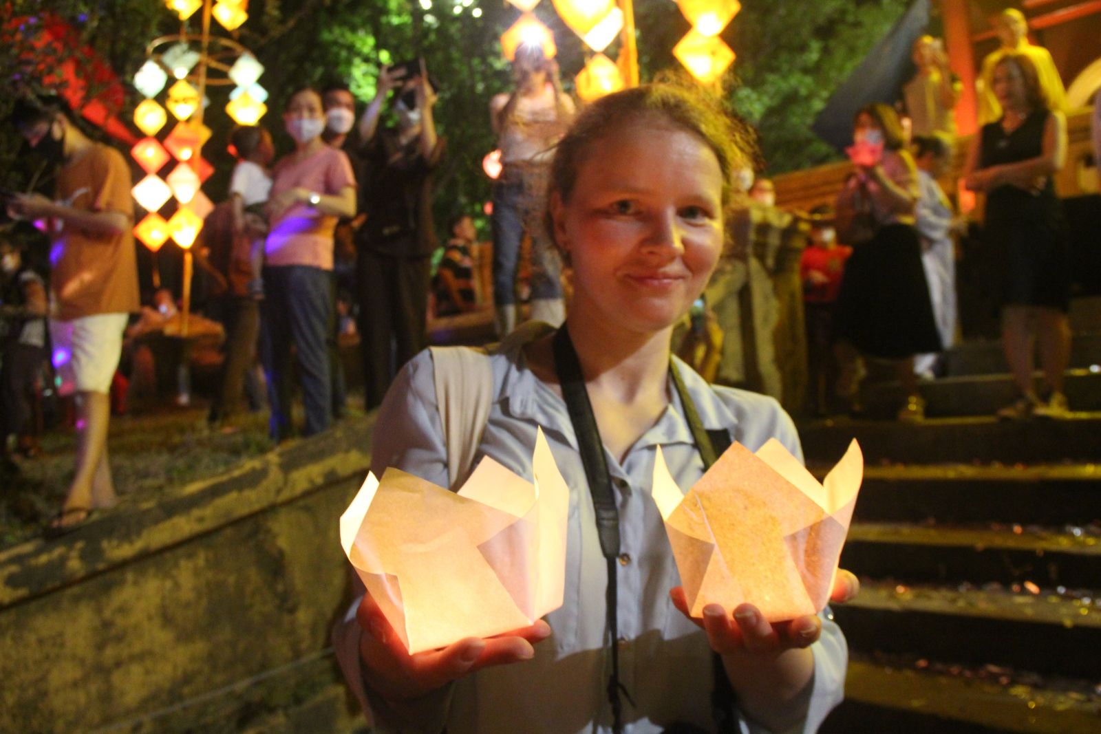 Một du khách nước ngoài trong trang phục áo lam tham dự lễ thả hoa đăng