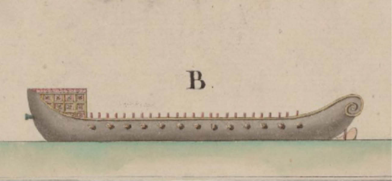Đối với các loại thuyền chiến thì cũng có cấu tạo tương tự nhưng được đóng có phần thô ráp hơn, kích thước cũng lớn mạnh hơn, nhất là ở phía trước có đặt một hoặc hai súng bắn đá. Ở Huế có khoảng 40 chiến thuyền loại này, với khoảng 50 đến 60 tay chèo. Ngoài ra, còn có loại chiến thuyền nhỏ hơn, thường được dùng cho thủy quân luyện tập hoặc vận chuyển lương thực hay các loại hàng nặng cho triều đình. Quân thủy đứng thẳng để chèo thuyền, họ thường ở trần, đóng khố với một giải nịt bằng lụa đen đơn giản (Henri Cordier, 1887, “Voyage de Pierre Poivre en Cochinchine”, Revue de l’Extrême-Orient, tập 3, số 1).