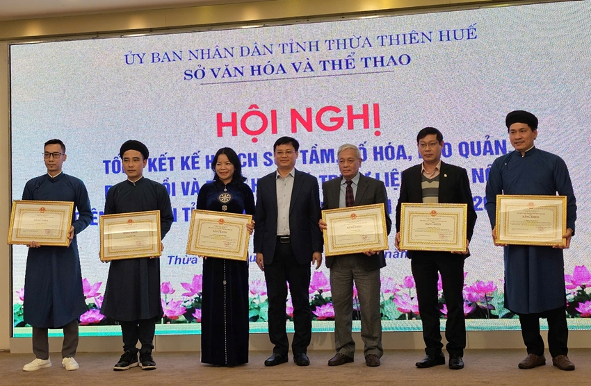 Dịp này, Chủ tịch UBND tỉnh và Sở Văn hóa và Thể thao cũng đã tặng bằng khen, giấy khen cho các tập thể, cá nhân có thành tích xuất sắc trong công tác sưu tầm, số hóa, bảo quản, phục hồi và phát huy giá trị tư liệu Hán - Nôm trên địa bàn tỉnh Thừa Thiên Huế giai đoạn 2020-2024.