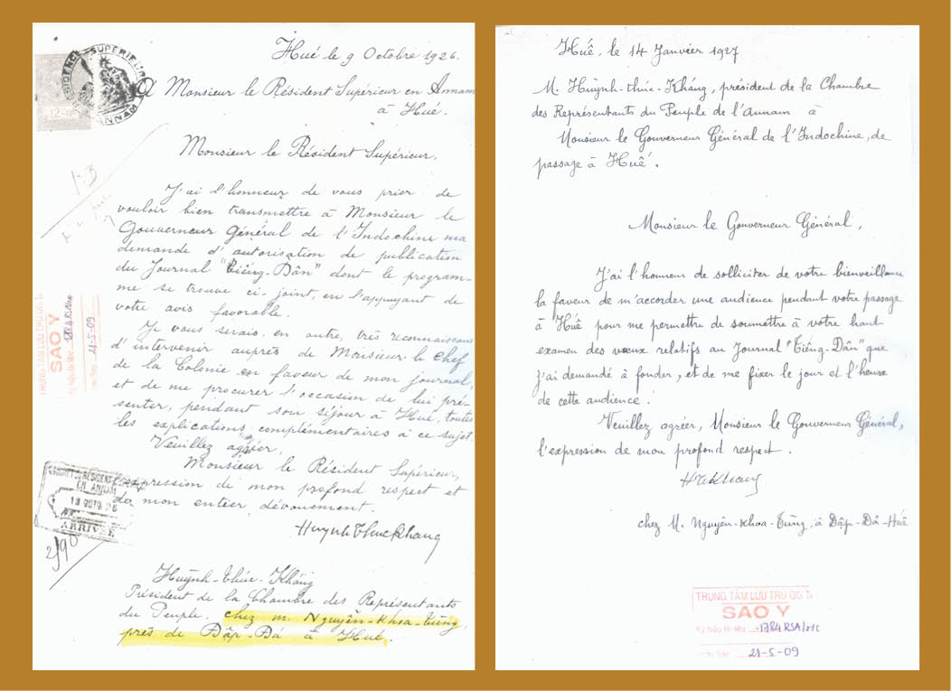 Trong quá trình nghiên cứu, chúng tôi đã tìm được một số tư liệu quý liên quan đến nơi đặt văn phòng cũng như việc xin xuất bản báo Tiếng Dân ở Huế, đó là ba bức thư viết tay bằng tiếng Pháp của Huỳnh Thúc Kháng gửi cho Khâm sứ Trung kỳ và Toàn quyền Đông Dương đề nghị họ giúp đỡ, tạo điều kiện cho Cụ được xuất bản báo Tiếng Dân. Cả ba bức thư này hiện có tại Trung tâm Lưu trữ Quốc gia IV (Đà Lạt), phông Khâm sứ Trung kỳ.