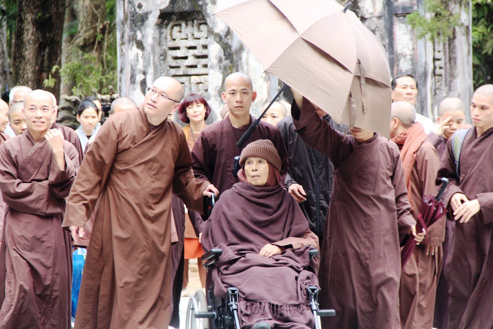 Thiền sư Thích Nhất Hạnh trong một lần được chúng thị giả đưa dạo chơi quanh Tổ đình Từ Hiếu