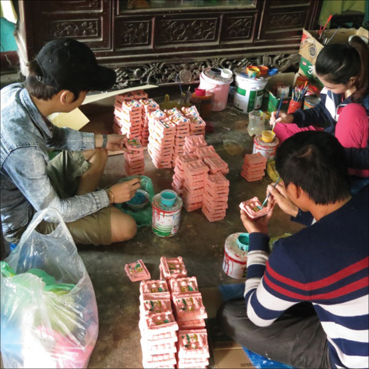 Trong khoảng không gian hẹp, những người thợ đang chăm chú với công việc. Một người cho đất vào khuôn rồi nén xuống khúc gỗ phẳng, hai người còn lại nhào đất, quét sơn lên ông Táo. Sơn màu đỏ thẫm được pha chế loãng. Người làm phải đeo khẩu trang, dùng tay tì mạnh, cọ và quét đi quét lại nhiều lần để sơn thấm đều. Người lành nghề mỗi ngày có thể quét khoảng một ngàn ông Táo.
