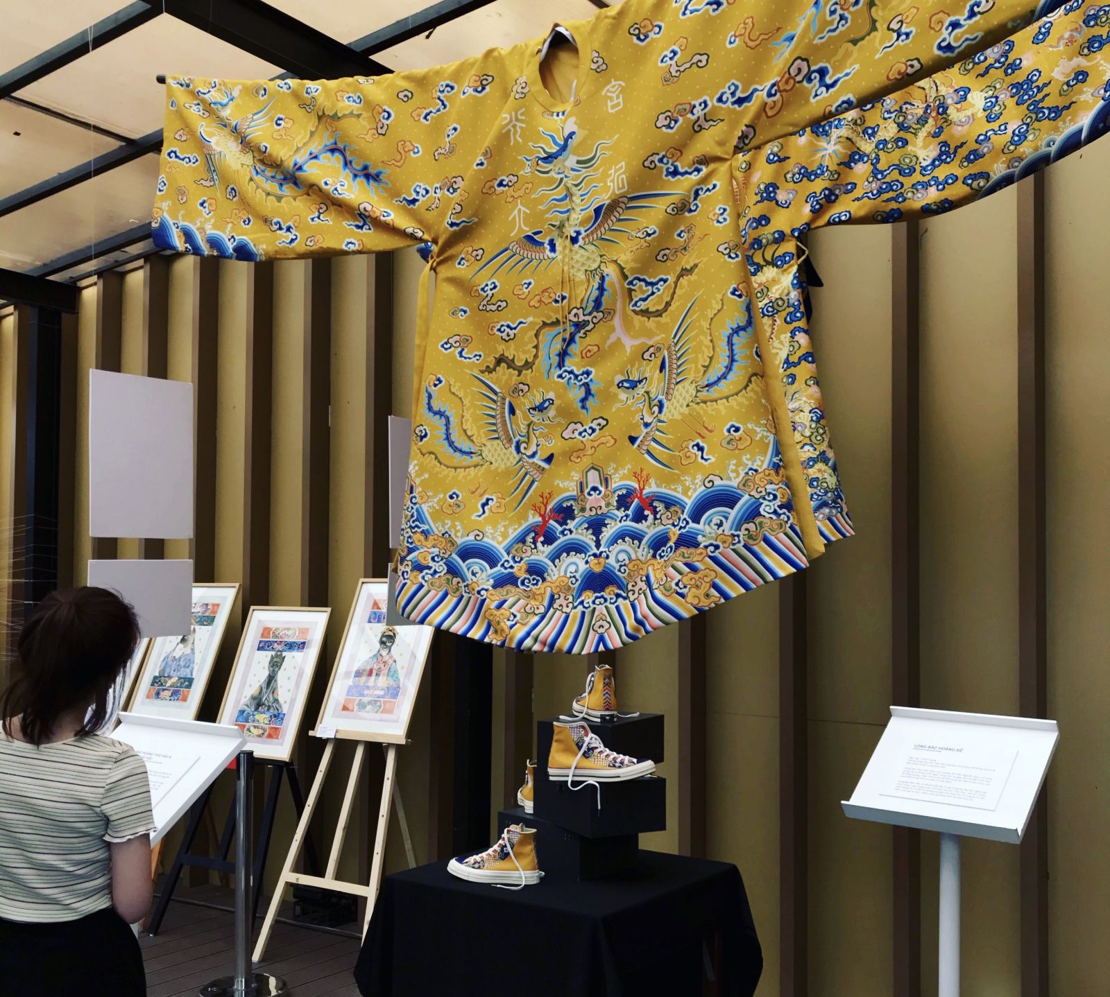 Triển lãm kết hợp phục dựng Triều phục nhà Nguyễn tại Vietnamme Talk, Sài Gòn. (Trong hình là Converse Nhật bình "Chánh Hoàng" cùng bản phục dựng Phụng bào của Hoàng thái hậu triều Nguyễn 1900-1920)