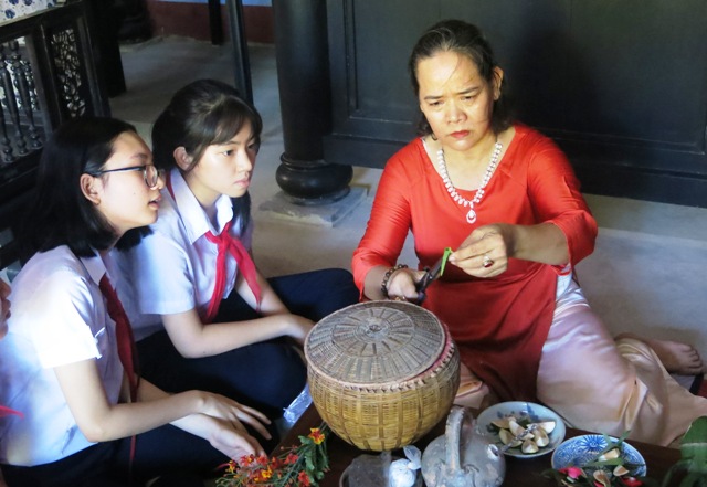 Nghệ nhân hướng dẫn các em học sinh cách têm trầu