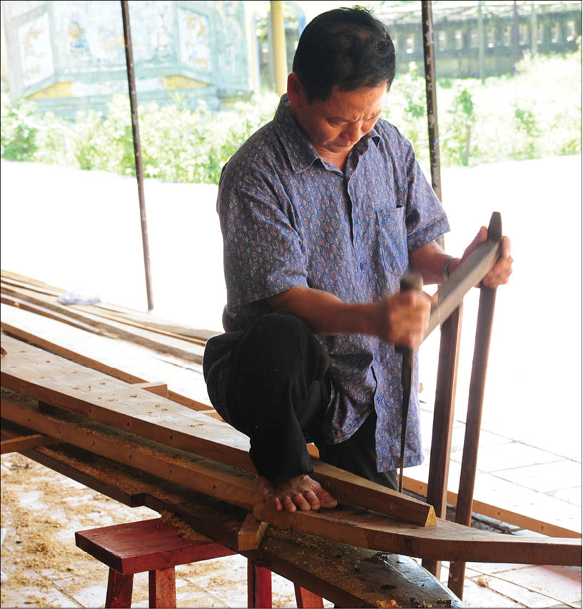 Bước qua tuổi ngũ tuần (sinh năm 1966), ông Lê Văn Vinh ở làng Dương Nổ (xã Phú Dương, huyện Phú Vang) là một người đặc biệt, có trong tay một nghề thủ công đặc biệt. Sinh ra trong một gia đình trải qua 4 đời làm nghề mộc, từ khi hơn 10 tuổi, ông đã theo nghề dưới sự chỉ dạy của cha - ông Lê Thiện. Học nghề trong gia đình, là con trai rất được yêu thương nhưng ông không nhận được nhiều sự ưu ái trong quá trình đào tạo bởi người cha nghiêm khắc. Bắt đầu từ những việc lặt vặt như quét dăm bào, chùi dọn đồ nghề, khuân vác gỗ… cho đến những bước làm quen với cưa, đục, bào, ông đã được cha rèn luyện đức tính kiên nhẫn, cẩn thận và “biết việc” từ năm 15 tuổi. Là người có năng khiếu, sáng ý và chăm chỉ nên ông được cha sớm đặt nhiều kỳ vọng, từng theo cha anh đi làm nhà, đồ gỗ khắp các vùng quê Bình - Trị - Thiên. Không chỉ có vậy, ở vùng quê gắn liền môi trường sông nước Phổ Lợi, bà con còn gắn liền với sinh kế đánh bắt thủy sản và quan trọng hơn, là lễ hội đua thuyền thiêng liêng, sôi động được tổ chức hàng năm nên từ một cơ duyên, gia đình ông đã nhanh chóng tích hợp, học thêm nghề đóng và sửa chữa trải đua.