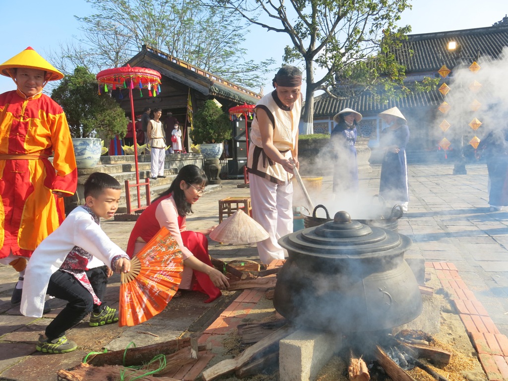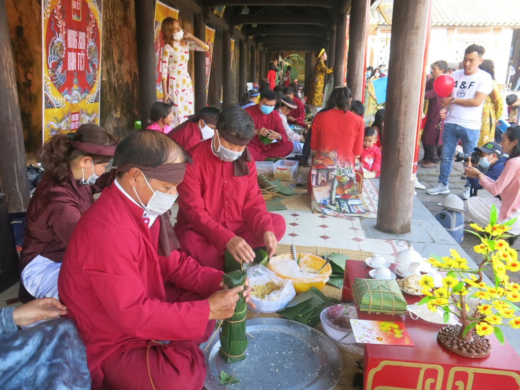 Không gian “Hương xưa bánh Tết” tràn ngập sắc xuân với các loại trang phục truyền thống, những đôi câu đối thắm sắc hoa xuân. Người dân và du khách được trải nghiệm không khí tết xưa qua hội thi gói bánh chưng, bánh tét của các đội thi đến từ Trung tâm Bảo tồn Di tích Cố đô Huế.