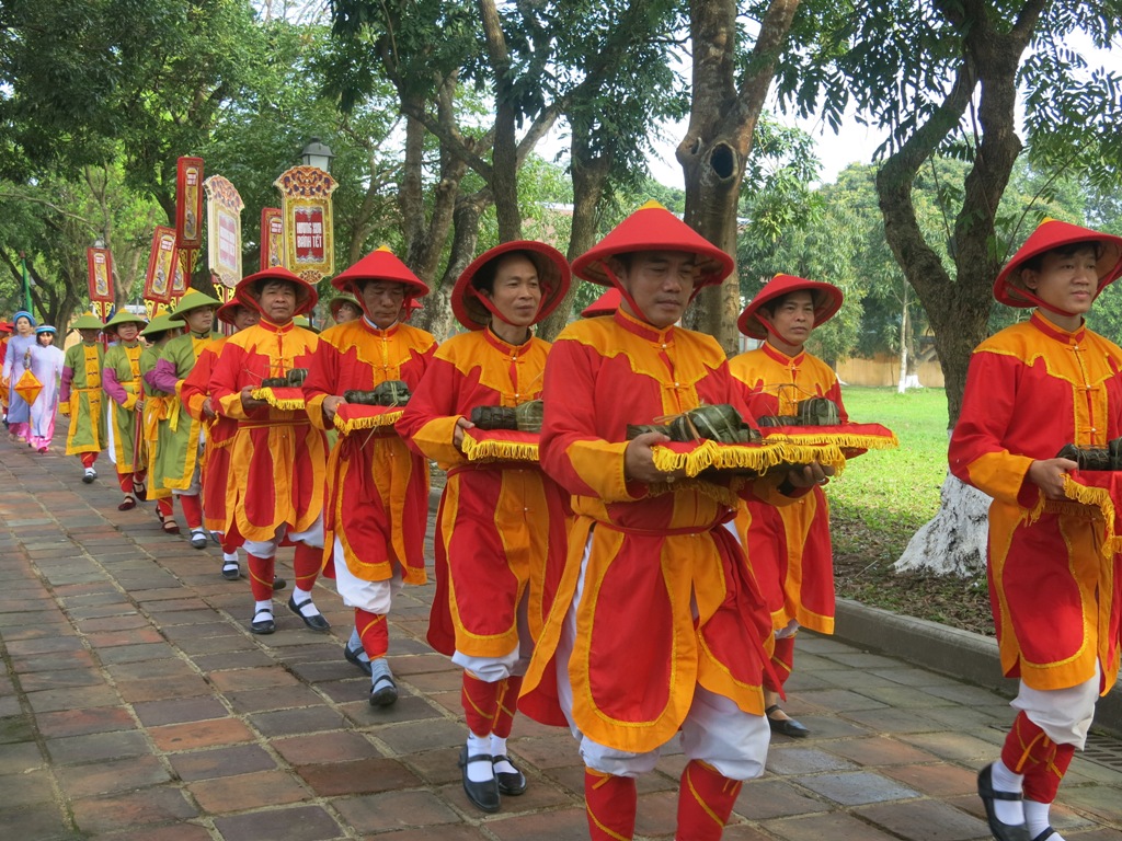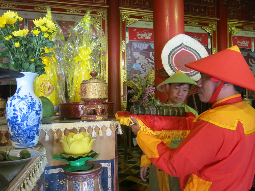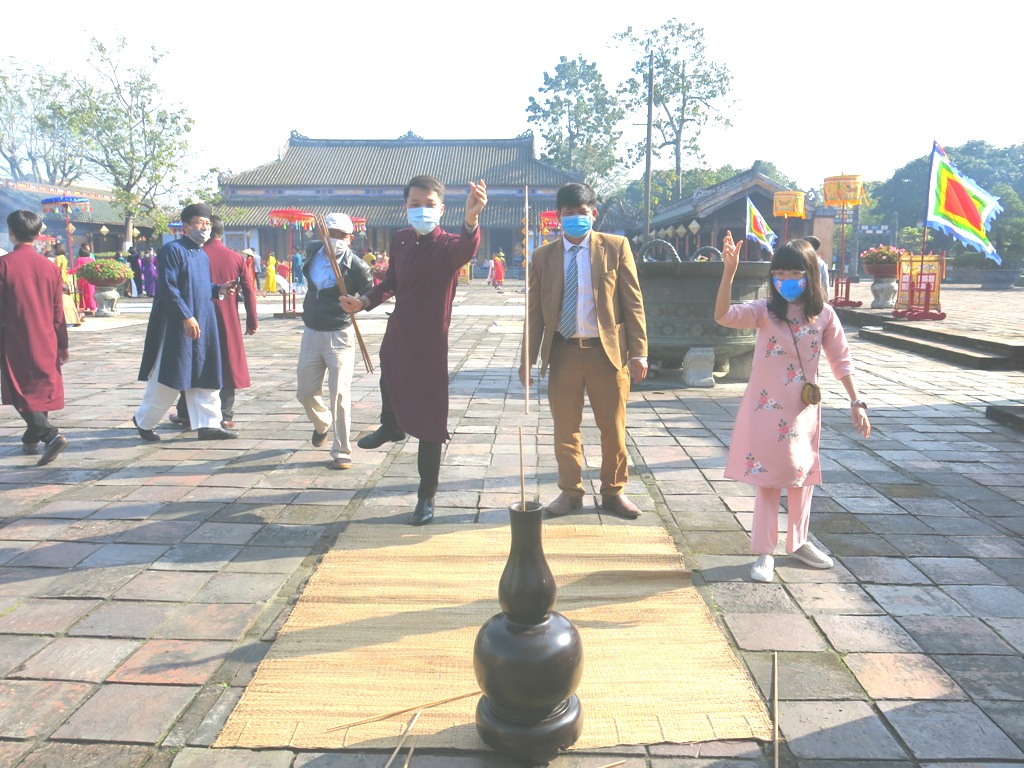 Sau nghi thức thả ước vọng lên trời cao với những mong ước: Tân niên an lạc, phúc lộc chan hòa, an khang như ý, thách thức vượt qua…, Trung tâm Bảo tồn Di tích Cố đô Huế đã tiến hành nghi thức rước bánh cung tiến tiền nhân tại Thế Miếu.