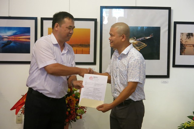 Viện Pháp tại Huế trao chứng nhận cho nghệ sĩ Lê Huy Hoàng Hải (bên phải)