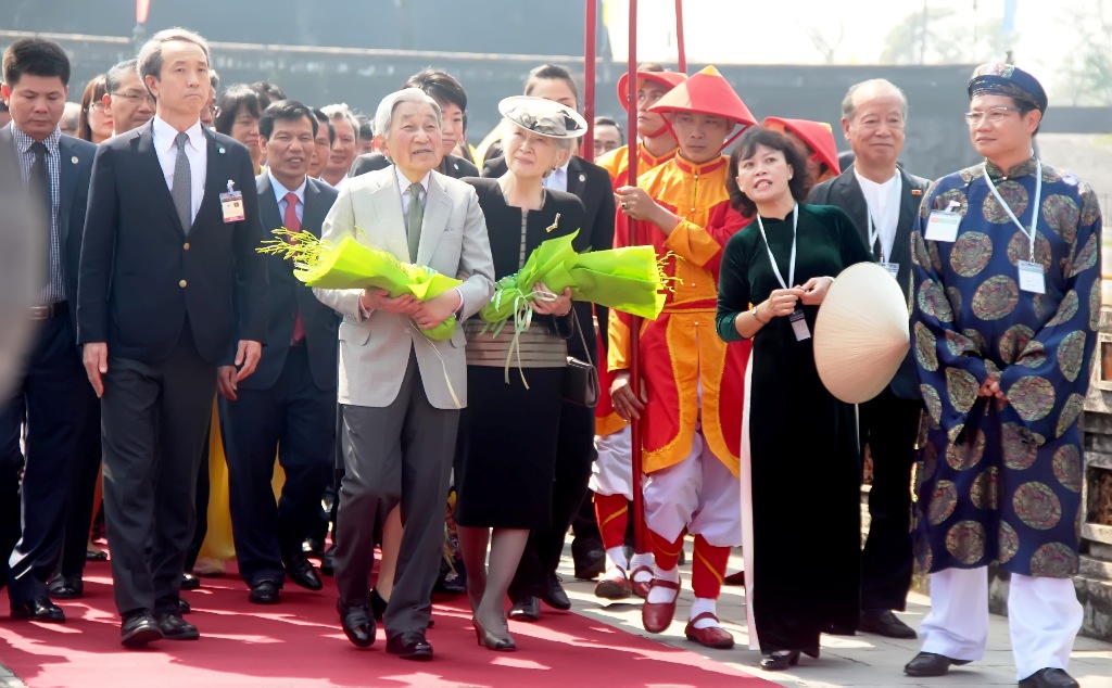 Nhật hoàng Akihito và Hoàng hậu Michiko (cầm hoa) tiến vào bên trong Ngọ Môn trong chuyến thăm Huế vào đầu tháng 3/2017. Chính Ngọ Môn cũng là biểu tượng được thể hiện trên nền nghệ thuật Trúc Chỉ để gửi tặng hai vị khách đặc biệt.