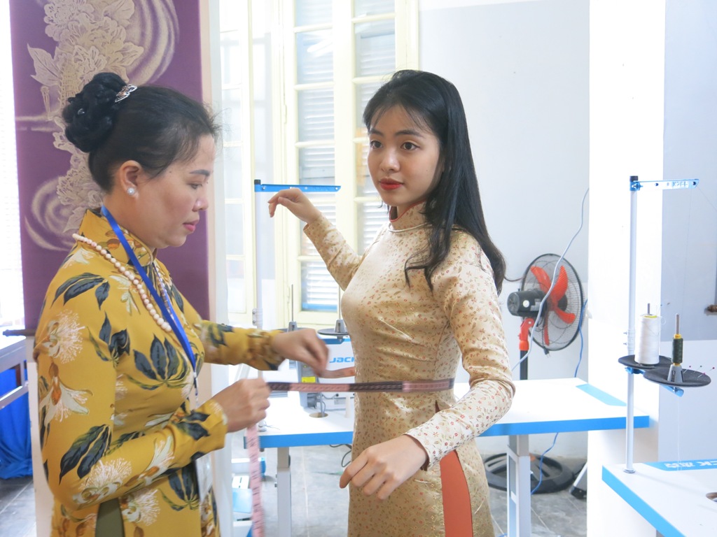 Tham gia trình diễn nghề may, chị Nguyên Trang, một thợ may có thâm niên trên 20 năm gắn bó với nghề giới thiệu: “Tôi rất vui khi nghề may được tôn vinh trong Ngày hội Áo dài Huế. Từ đây, vẻ đẹp của chiếc áo dài Huế được nhiều người biết đến và lan tỏa xa hơn. Ở đâu cũng may áo dài nhưng áo dài Huế vẫn có nét khác biệt ở vẻ truyền thống, tà rộng, cách may thủ công, tỉ mỉ…”.