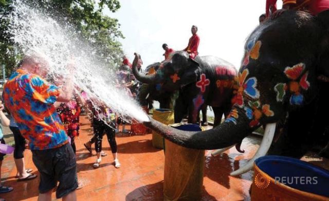 Voi phun nước vào người tham gia lễ hội Songkran ở tỉnh Ayutthaya, phía bắc Bangkok, Thái Lan. Ảnh: Reuters