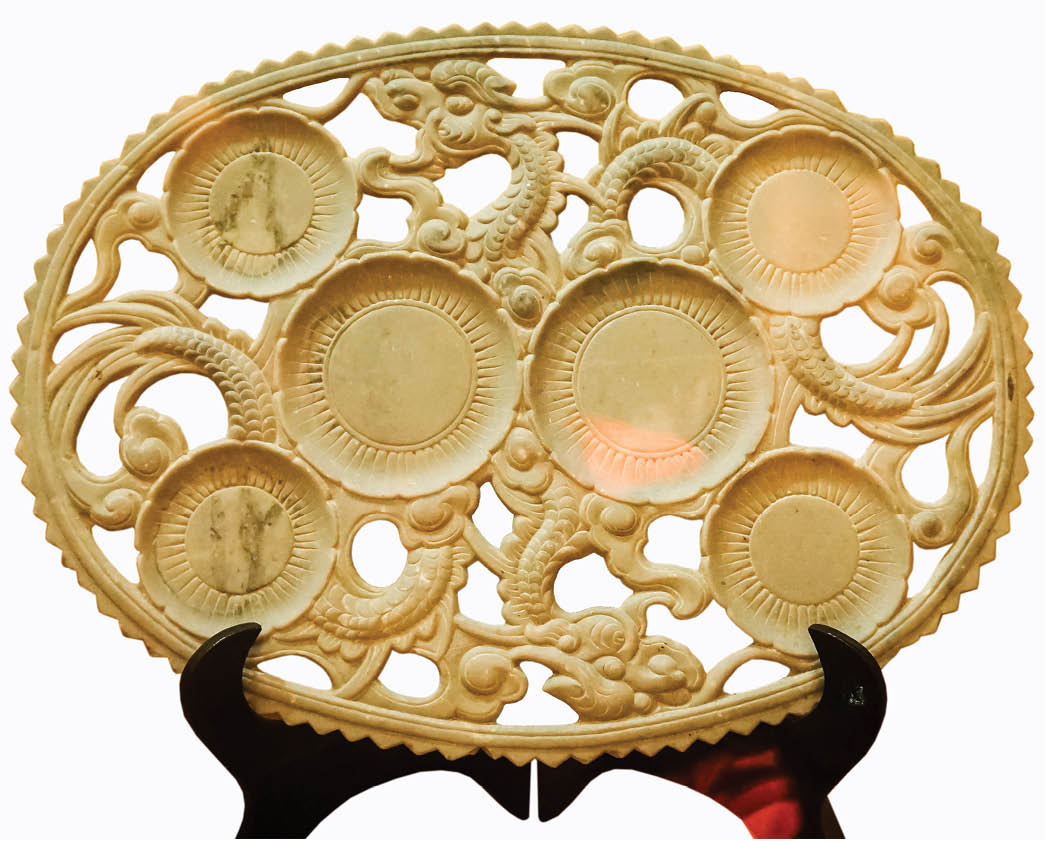 Hiện vật thứ hai là khay đá trắng hình oval nguyên mảng được trang trí đường diềm bao quanh, ở trong chạm “Song long ẩn vân” uốn lượn theo vị trí đặt ly, ấm một cách tinh xảo. Tay nghề của nghệ nhân chạm khắc tác phẩm này thật khiến người xem thán phục, nhất là sự thể hiện họa tiết hai con rồng hòa vào khung hình với các tách trang trí cánh hoa mai được bố cục cân đối, hài hòa. Kỹ thuật chạm nổi, chạm xuyên thủng trên đá của nghệ nhân đạt đến trình độ cao, thể hiện qua độ mỏng dày, to nhỏ, cong dãn các chiều ở từng chi tiết của nét chạm. Độ nổi khối bồng bềnh của mây sóng, nét vút như tia lửa của vây đuôi rồng, từng vảy rồng, từng nét cánh hoa cũng được chăm chút một cách tinh tế, cẩn trọng mà không tìm thấy một nét chạm lỗi dù là nhỏ nhất. Hiện vật này thể hiện trình độ thẩm mỹ của nghệ nhân thời Nguyễn trong sáng tạo những vật dụng sinh hoạt.