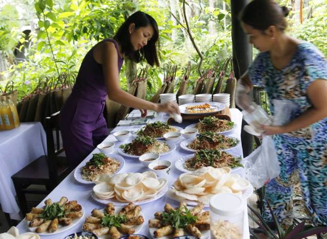 Hướng dẫn du khách làm các món ăn tại Thủy Biều, TP. Huế