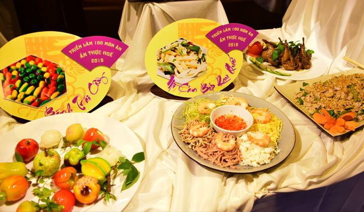 Các món ăn được trưng bày tại Triển lãm 100 món ăn ẩm thực Huế 2018 tại Festival Huế lần thứ X