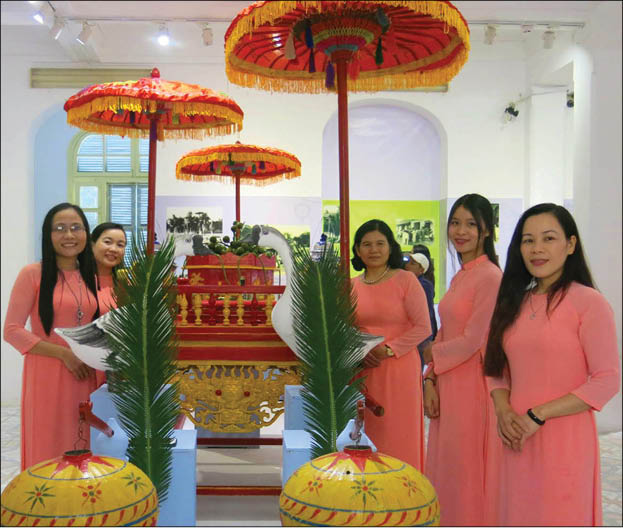 Các nhà nghiên cứu, nhà văn hóa tham quan không gian trưng bày đám cưới truyền thống Huế tại Bảo tàng Văn hóa Huế. Ảnh: Phan Thành