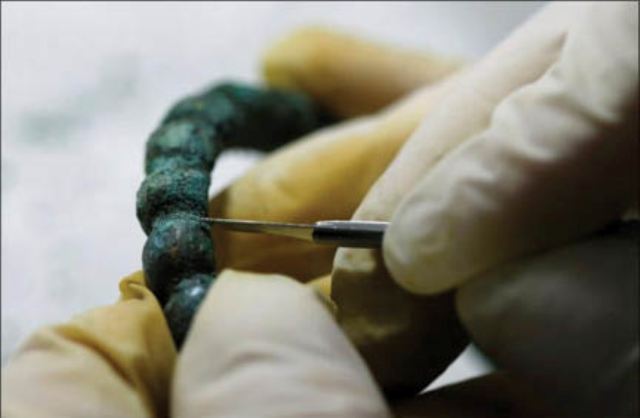 Chuyên gia đang phục hồi hiện vật kim loại thời tiền sử tại Bảo tàng Quốc gia Sarajevo. Ảnh: Reuters