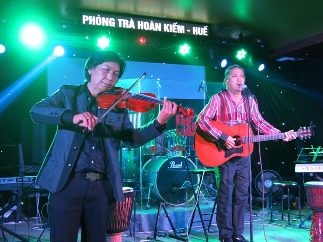 | Nhạc sĩ Diệp Chí Huy (bên phải) cùng bạn của mình biểu diễn ca khúc trong “Ngày gió qua sông”. |